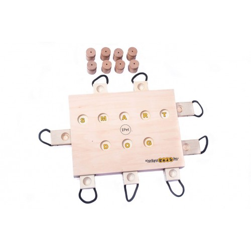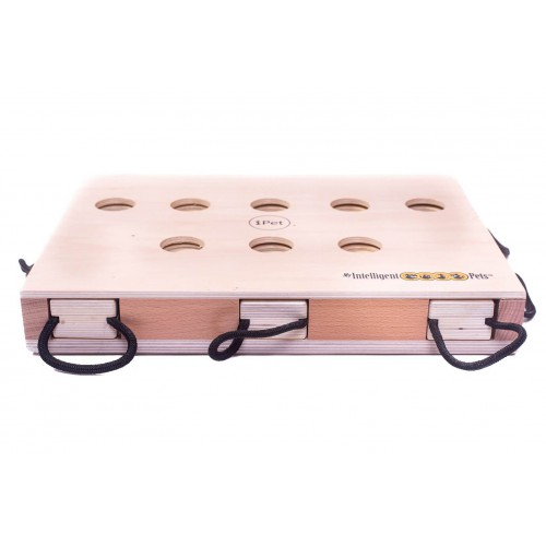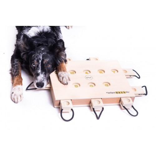 Length: 14.00 Width: 10.00 Height: 1.00 Length: 14.00 Width: 10.00 Height: 1.00 iPet - Smart Dog is a dexterity game for dogs. It has a difficulty grade of 4 Paws. The game is a simple binary computer made of wood in the shape of a laptop. Attached to each of the game's four sides are eight pull-out plates with openings for treats. Individual plates are blocked by other plates, so that they need to be pulled out in predefined order. Once the dog has solved all tasks correctly the display on the top shows Smart Dog. "iPet(R)" is recommended for dogs' mental activity. As highly intelligent animals they need an appropriate balance to physical activity (walking, running, agility), otherwise their mental abilities are not challenged sufficiently. This can lead to unwanted behaviour by the dog: aggression, separation anxiety, frustration, destructiveness, restlessness or impatience. This game trains a dog's concentration and dexterity, and encourages its natural instincts of curiosity, drive to play and sense of smell. Your dog will love to see you set up the game as it can prove itself to you. This will strengthen the bond between you and your dog as well as its self-confidence. These intelligence games are a meaningful and appropriate activity for dogs that is recommended by trainers and veterinarians. How to play: 1. Hide your dog's favourite treats in the plates' indents and under the pieces on the game's top surface. Let the dog watch as you set up the game in order to stimulate its curiosity. 2. Encourage your dog to start searching. Be patient and show it how the game works. For instance, you could show it where a treat is waiting for it, and the order in which it has to solve the problem. This way you can make sure that your dog enjoys playing the game together with you and can solve the task. 3. Initially do not use the pieces. Increase the level of difficulty by adding the pieces on the game's top surface only when your dog can solve the initial problems without any difficulty. That way your dog is constantly dealing with new challenges, and the game provides a meaningful and appropriate activity that it enjoys. The game should always present your dog with challenges it can solve. If after a few attempts the dog cannot solve the puzzle it may lose motivation, so if the game is too difficult for your dog, try other games with a lower grade of difficulty first. Never let your dog play unsupervised, and intervene if it starts to chew pieces of the game. Regularly check the pieces for any damage such as splinters. Clean by wiping with a damp cloth, and do not use abrasive cleaners. Additional information "iPet(R)" is made of certified wood covered in a water-based varnish that is not harmful to humans and animals. Please keep the game dry and free of water, as the wooden pieces may swell otherwise. Use only dry treats when playing "iPet(R)-Smart Dog". "iPet(R)" is not a toy for children! My Intelligent Pets(R) games are protected by several international patents as well as name, brand, design and copyright laws. Enjoy playing!