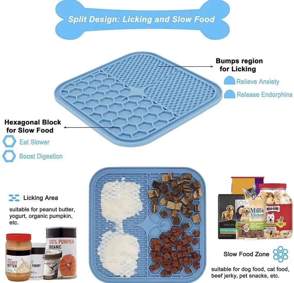 3. Serve Healthy Snacks: The licking pad is suitable for a variety of snacks and foods that serve yogurt, peanut butter, purees and organic healthy snacks. Food settles on the surface of the mat, which greatly slows feeding and prolongs enjoyment. Fewer calories, healthier food and longer duration. Alternative to slow feeding dog bowls.