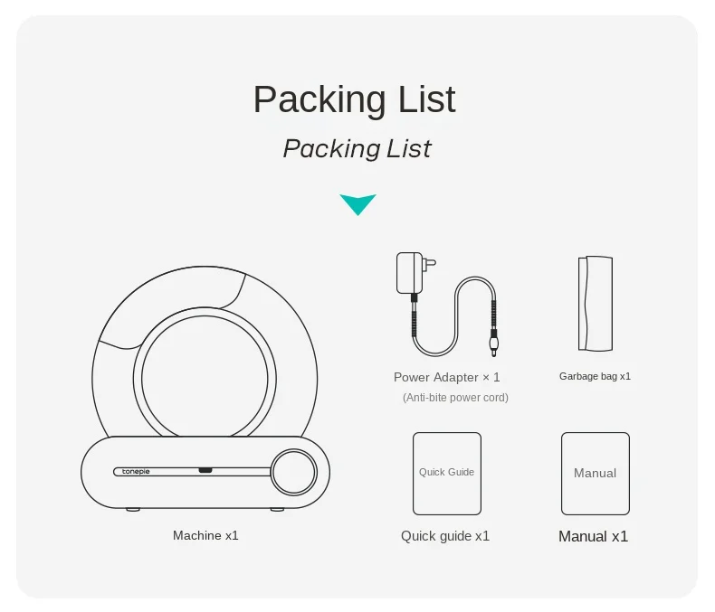English package, english operation panel, english instruction book Complimentary 30 garbage bags .