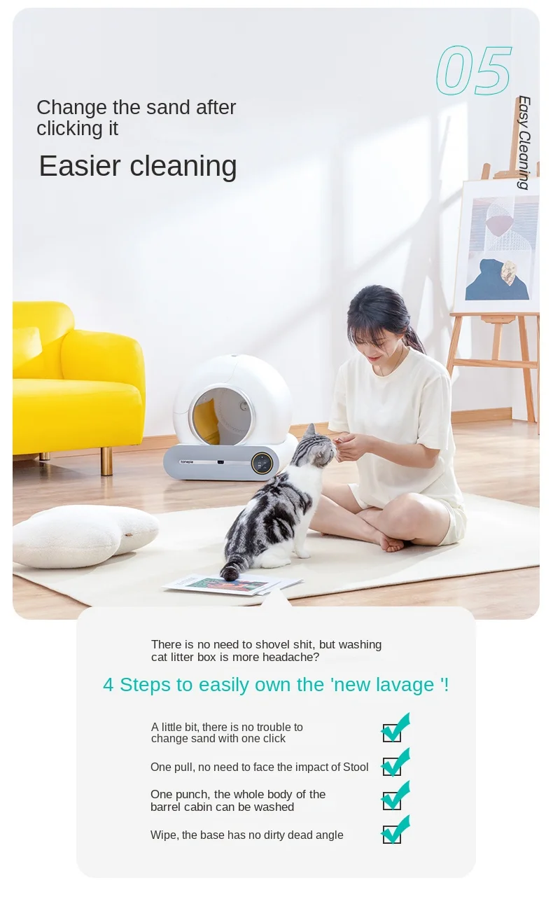- Smart Cleaning self cleaning litter box has automatic cleaning modes, you can watch the cat litter box clean itself versus fighting the dust. The one-click cat litter replace function can empty the old litter at one time, no more scooping! Truly free your hands.